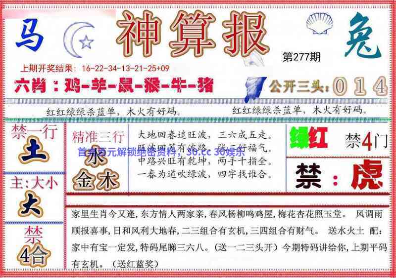 277期:七肖【牛猴兔蛇羊虎鸡】开:虎16准 |